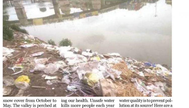 River Jhelum, a major tributary out of five major tributaries that are- Satluj, Beas, Ravi Chenab and Jhelum which are ultimately merging with river Indus in Pakistan is the west-flowing river. The Jhelum (Vyeth in Kashmiri, Vetesta in Sanskrit and Hydaspes in Greek) is the main waterway of the Kashmir valley. Jhelum river originates from a magnificent spring called “Chashma Verinag”.The total geographical area of Jhelum basin up to Indo-Pakistan border is about 34775 Sq.Kms. with a total length of 402 Kms. But the length of Jhelum in India up to existing ceasefire line is about 165 Kms. With a catchment area of about 17622 Sq. Kms. and lies 32°-58′-42“ to 35°-08′-02” north latitude and 73°-23′-32“ to 75°-35′-57” east longitude and is mainly confined within the Kasmir Valley in India. The river Jhelum runs in the Valley is surrounded by mountain ranges which rises to a height of 5487 m on the northeast. Peaks of these mountainous range are mostly covered by snow cover from October to May. The valley is perched at an average elevation of 1829 m above sea level and is approximately 135 kms. in length and 32 to 40 Kms. in breadth. The Kuti and Brahmasakal are the highest peaks at 4675 mts. in elevation in the basin.Water pollution occurs when harmful substances—often chemicals or microorganisms—contaminate a stream, river, lake, ocean, aquifer, or other body of water, degrading water quality and rendering it toxic to humans or the environmentThe Jhelum is greatly utilised for its water and food such as fish. Since Jhelum passes through many rural and urban settlements, the river gets polluted with sewage from settlements, agricultural runoff and effluent discharges from various small and large industrial units. This widespread problem of water pollution is jeopardizing our health. Unsafe water kills more people each year than war and all other forms of violence combined. Meanwhile, our drinkable water sources are finite: Less than 1 per cent of the earth’s fresh water is accessible to us. Without action, the challenges will only increase by 2050, when global demand for fresh water is expected to be one-third greater than it is now. Sip a glass of cool, clear water as you read this, and you may think water pollution is a problem . . . somewhere else. But while most countries have access to safe drinking water, potentially harmful contaminants—from arsenic to copper to lead—have been found in the tap water of every single state in the nation and even many states do not have the facility of proper drinking water. What Can You Do to Prevent Water Pollution?The best way to improve surface water quality is to prevent pollution at its source!
